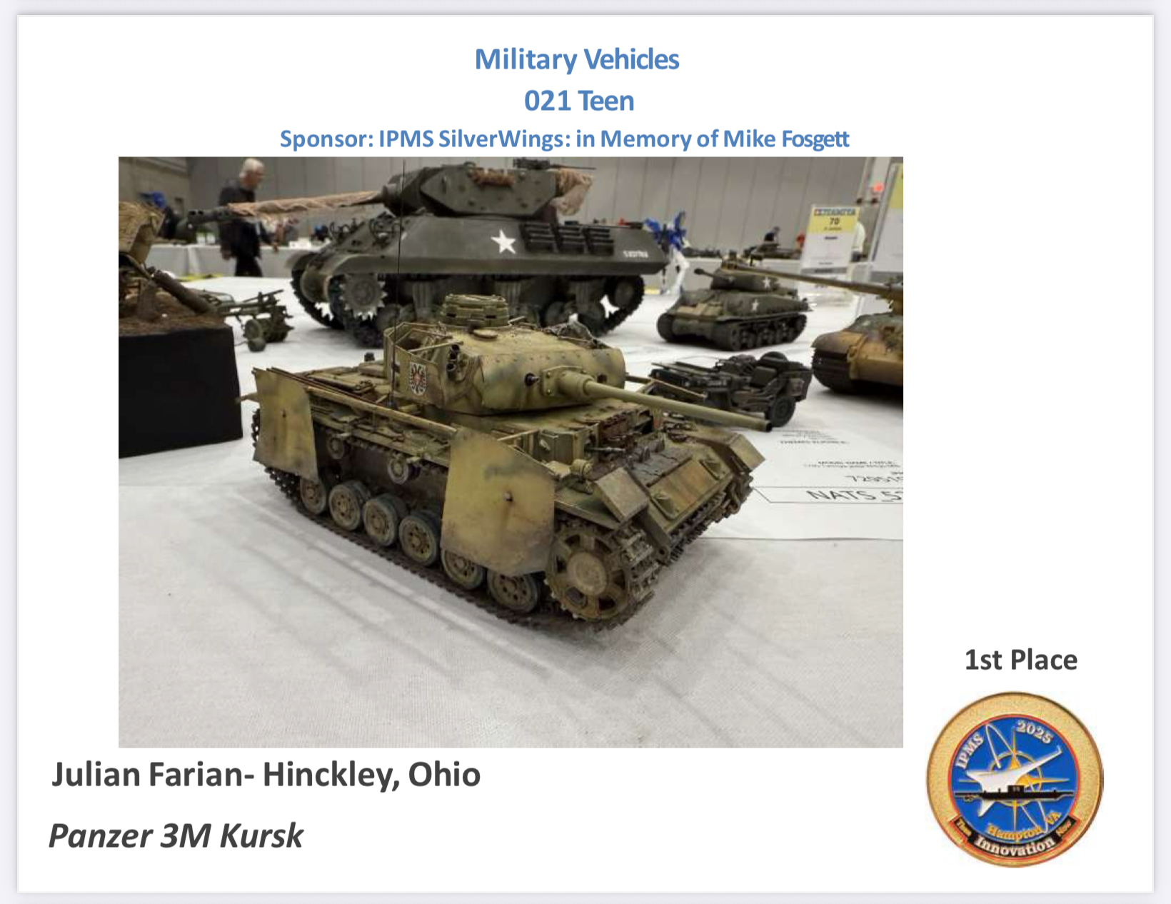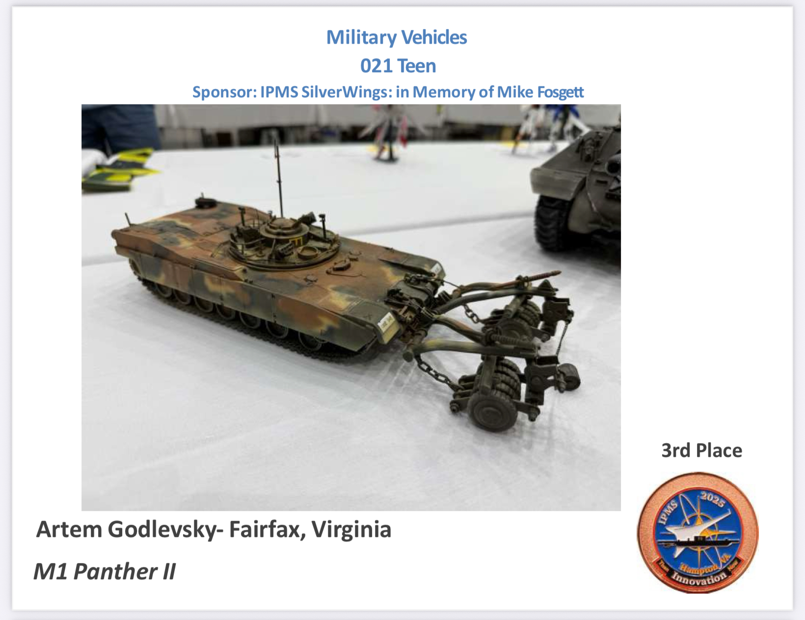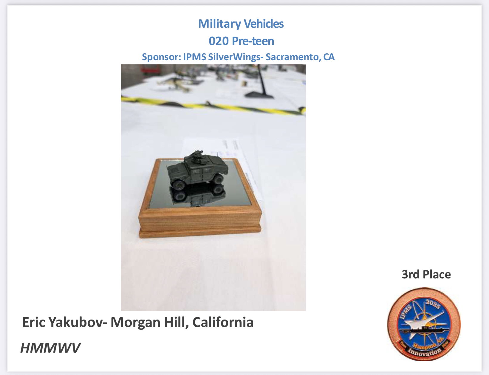 This year, IPMS SilverWings proudly sponsored three categories – Juniors: Pre-teen Aircraft, Pre-Teen Military Vehicles, and Military Vehicles -in memory of our friend and fellow modeler, Mike Fosgett. Mike’s passion for the hobby and his dedication to our club continue to inspire us, and it was an honor to celebrate his legacy in this way.